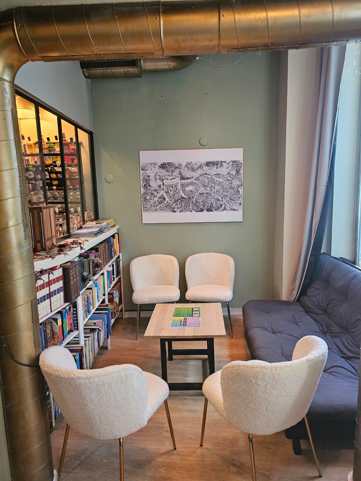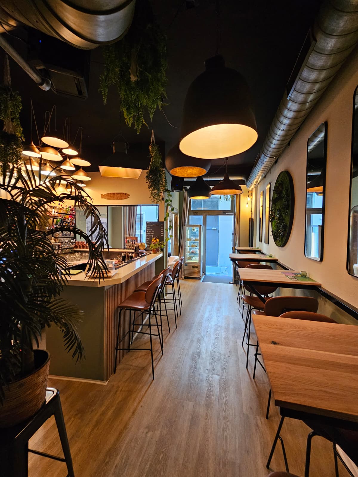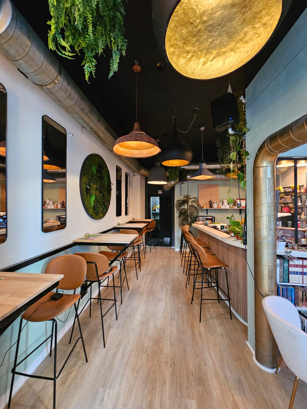 Die Atmosphäre ist warm, persönlich und ein bisschen literarisch. Bücher, gedämpftes Licht, Pflanzen — und Katerinas Espresso ist perfekt.